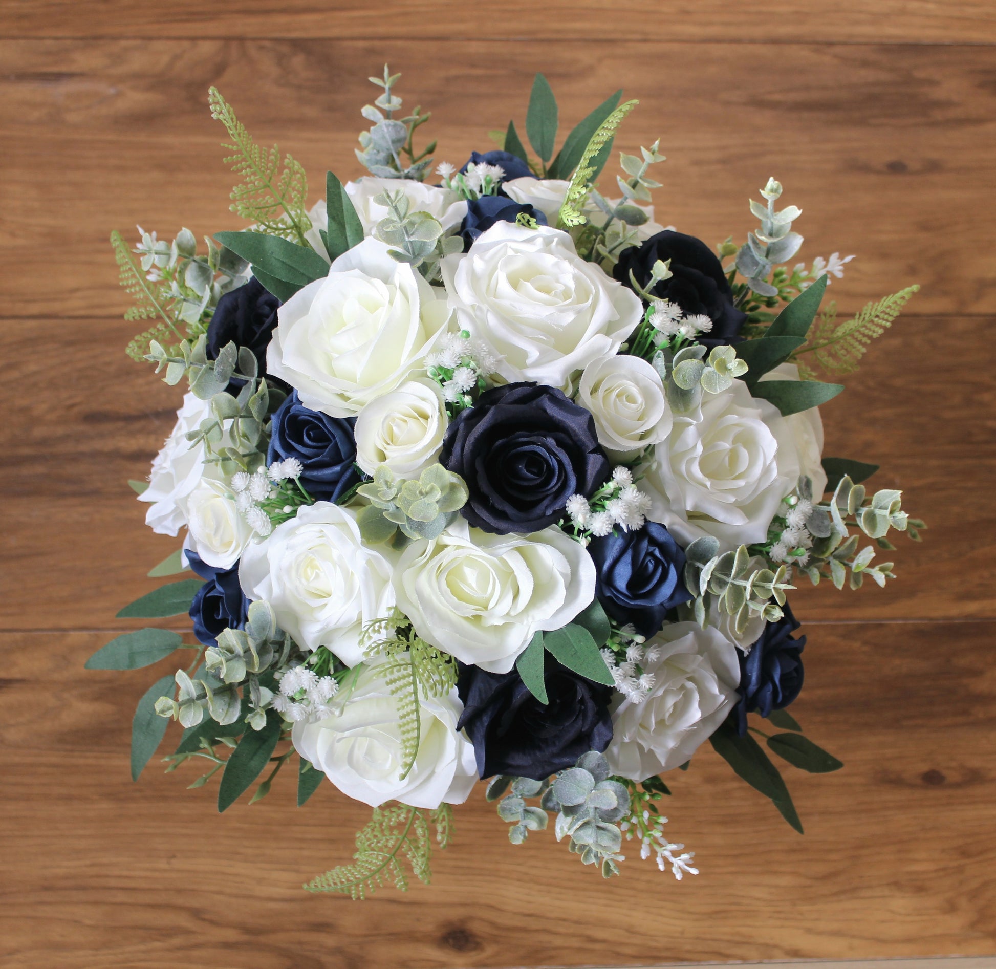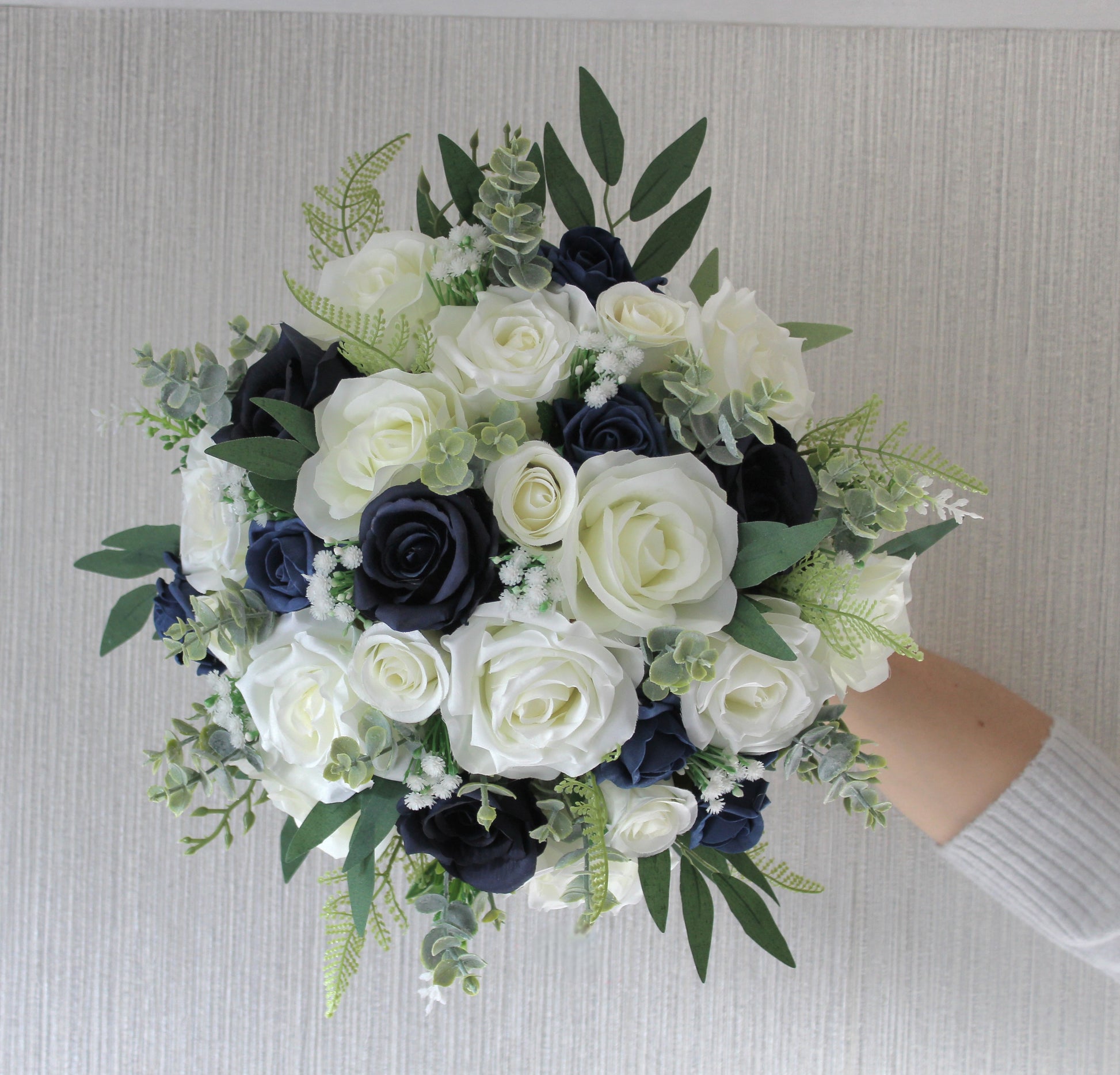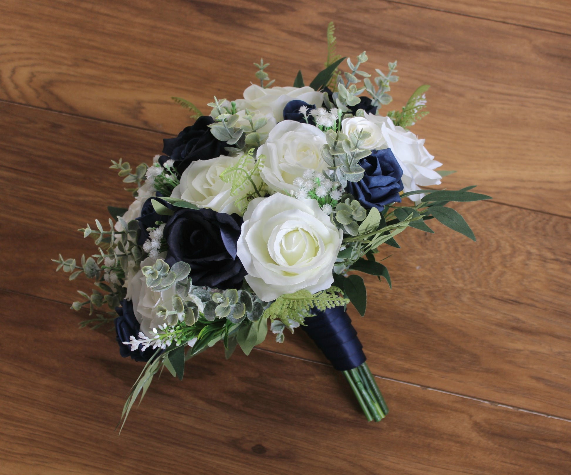 Photo shows navy and ivory flowers, with navy ribbon for the bridal bouquet and the bridesmaids bouquets finished in ivory ribbon.