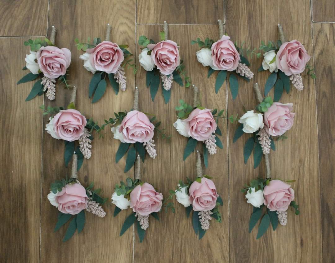 These classic buttonholes contain a very high grade single stem silk open rose, rose bud, gypsophilia, eucalyptus, astilbe and willow leaves