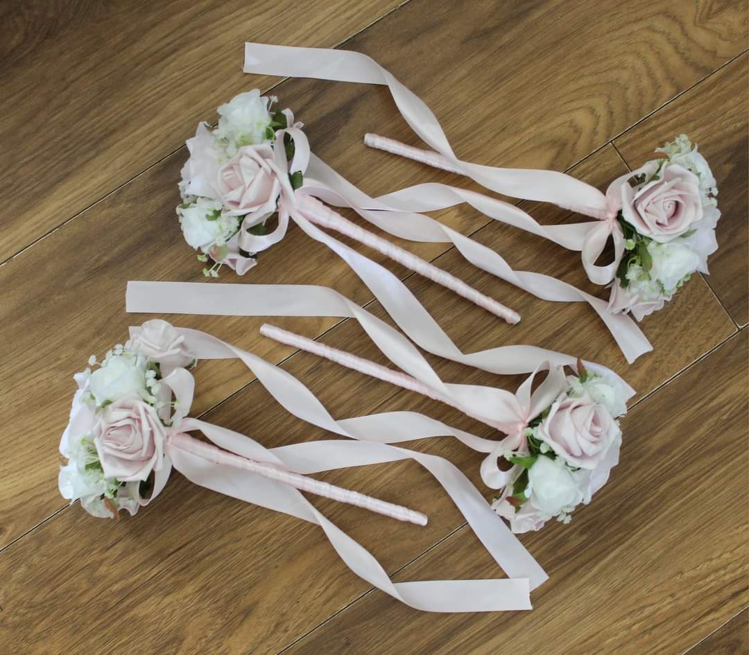 A fairytale themed handmade flower girl wand created using single stem silk roses, colourfast foam roses and gypsophilia in pale pink and white.