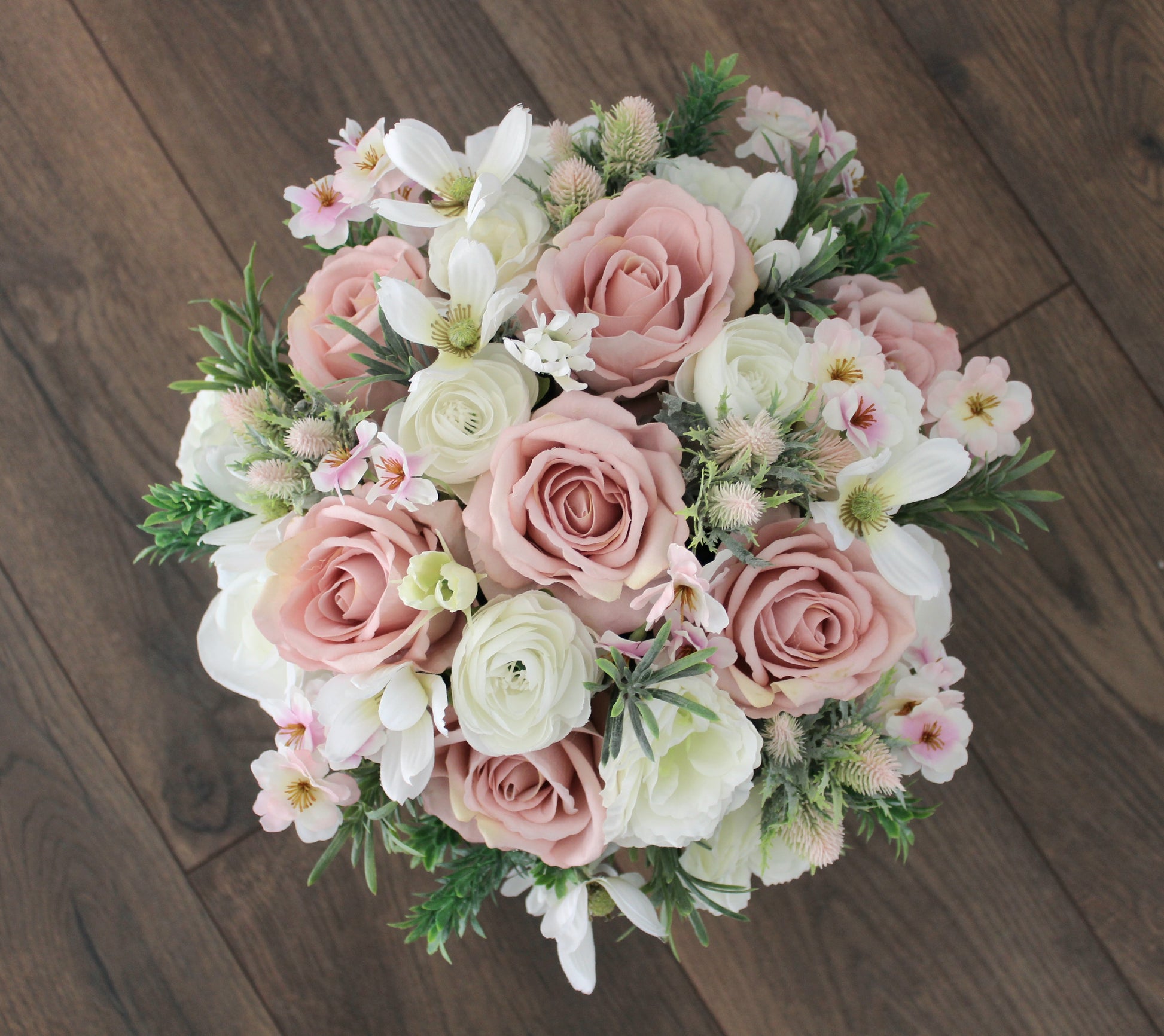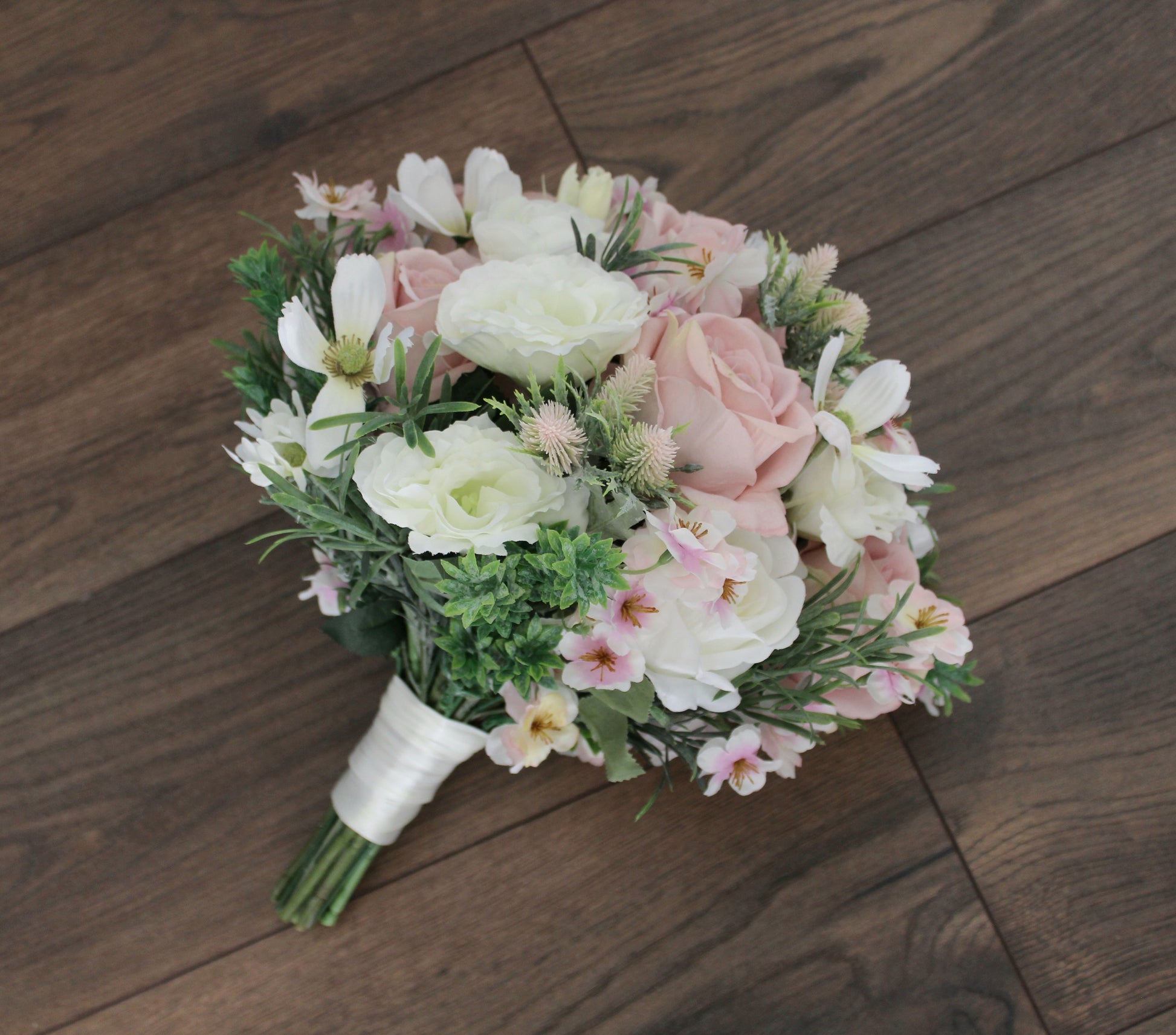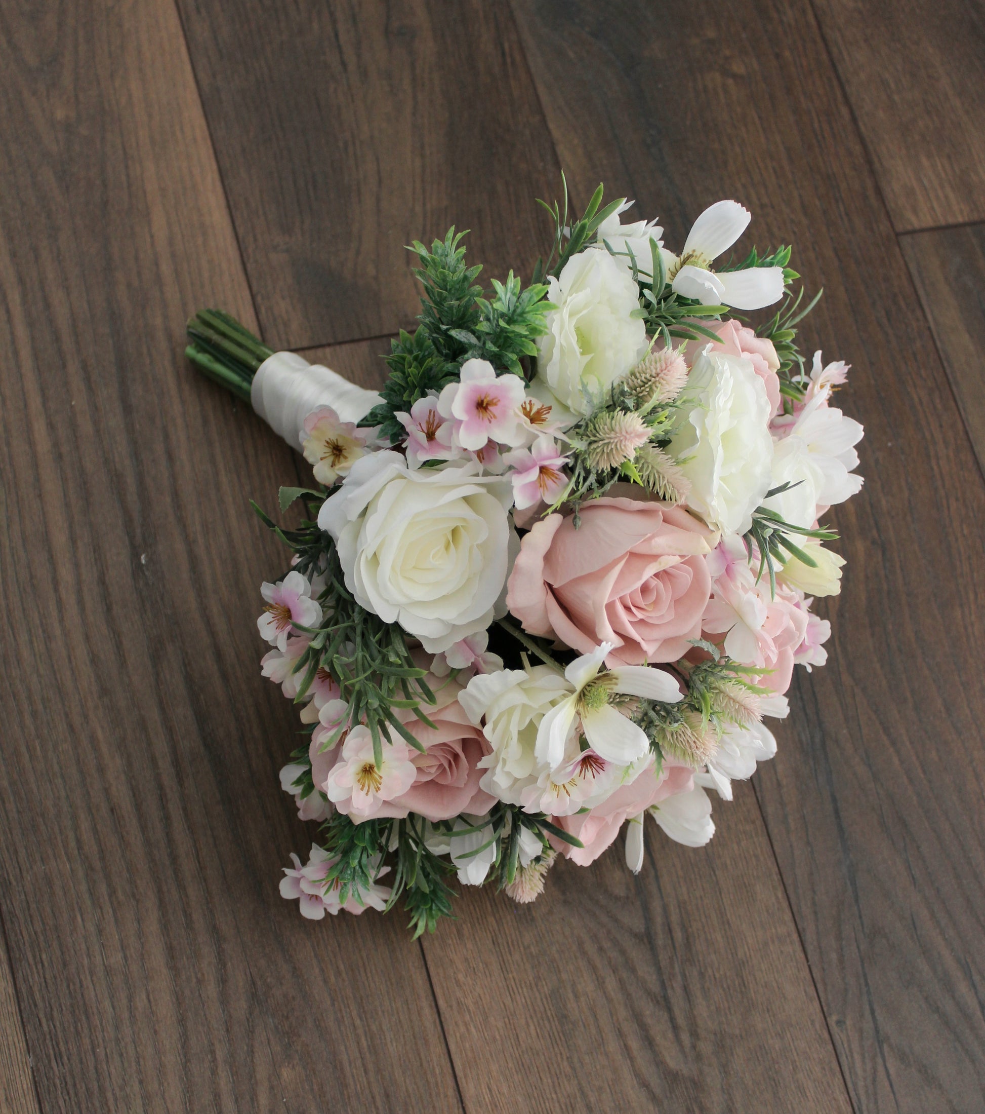 A beautiful handmade bridal bouquet created using silk roses, lisianthus, daisies, cosmos, rosemary, thistles and blossom