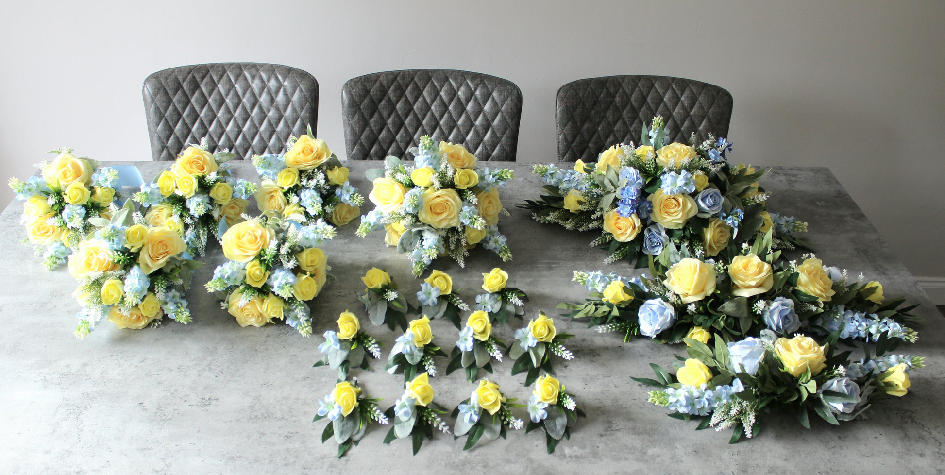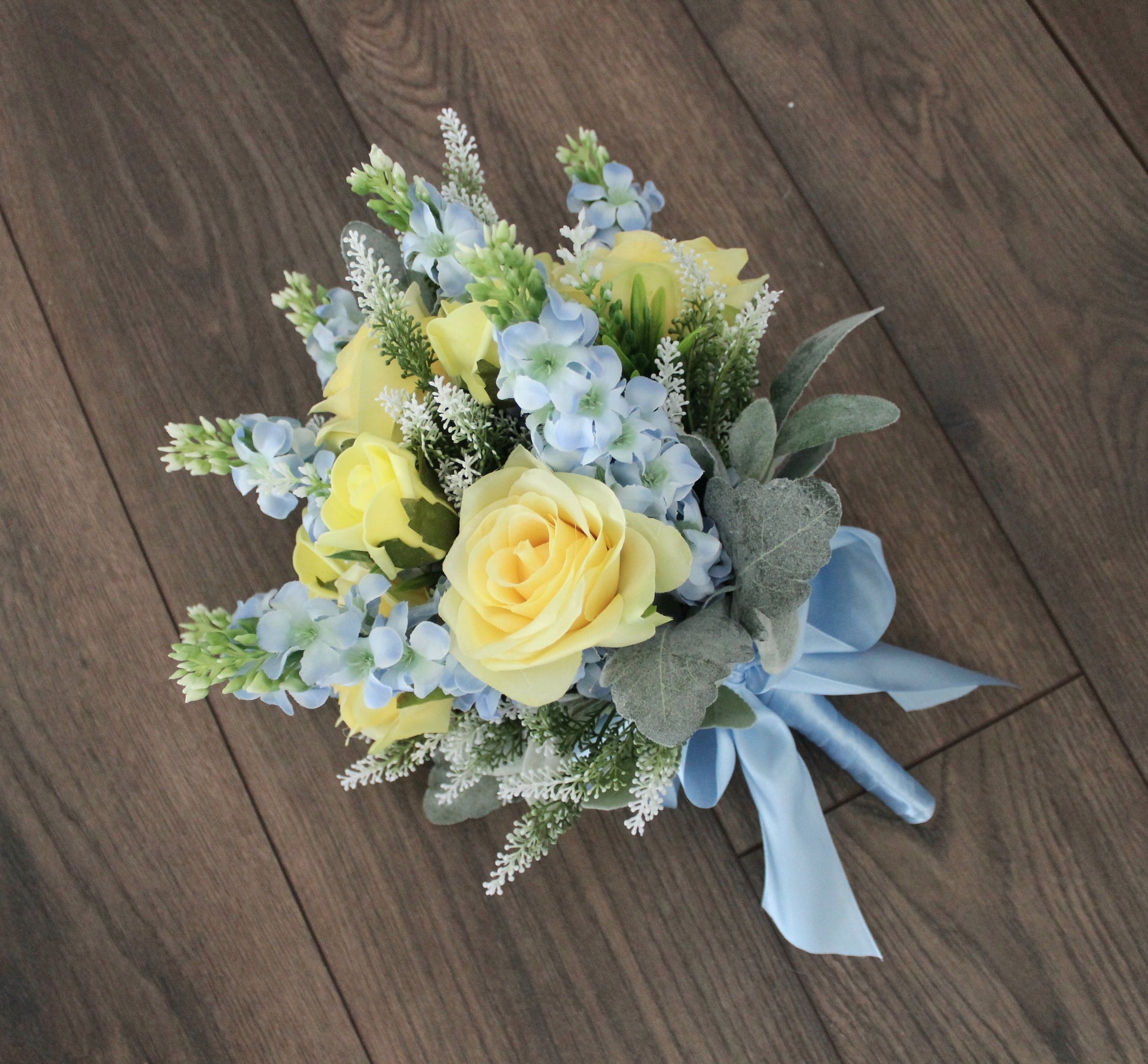 A beautiful handmade bouquet created using single stem silk roses, colourfast foam roses, delphinium, astilbe, willow leaves and lambs ear leaves. A gorgeous Bridgeton theme.