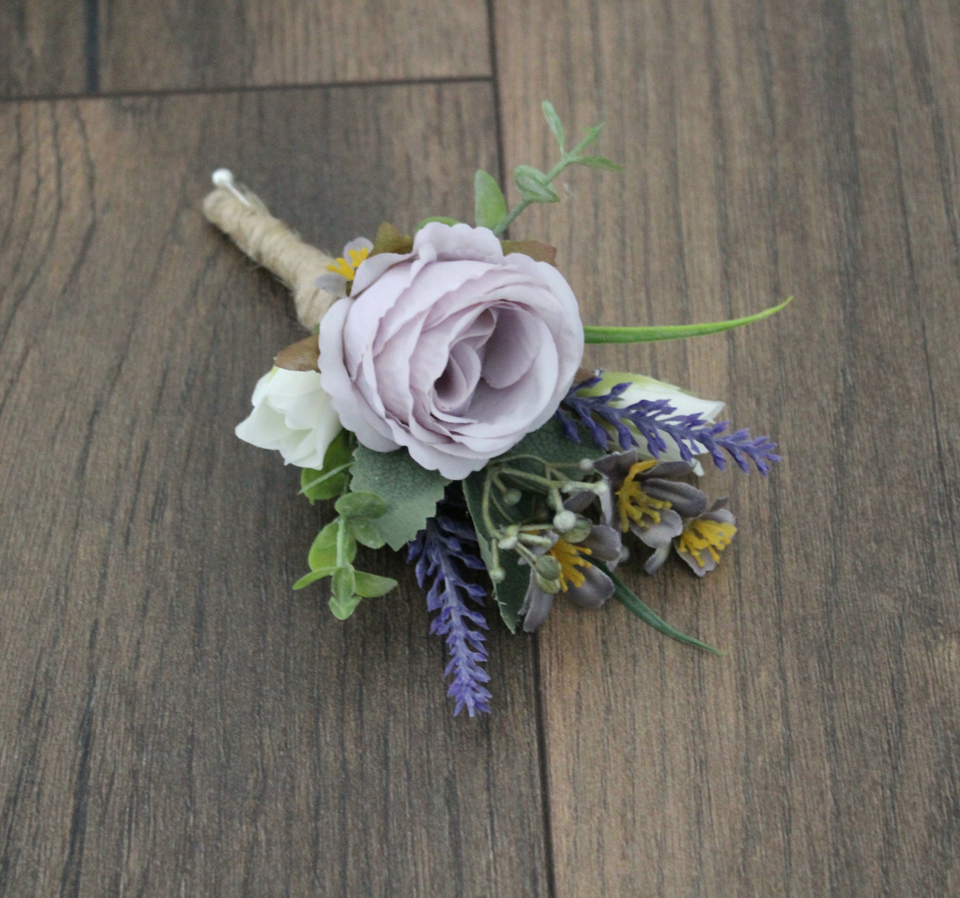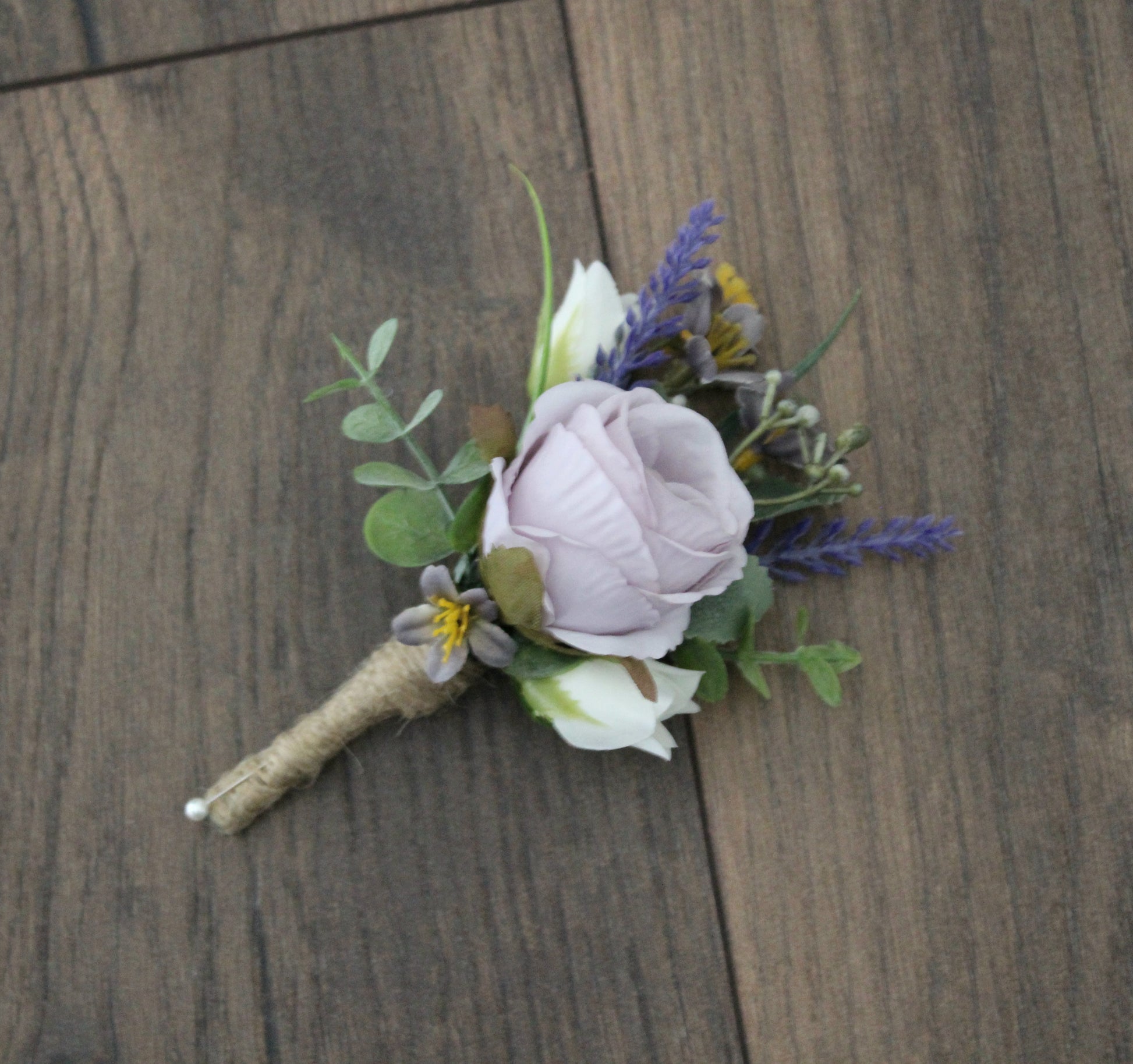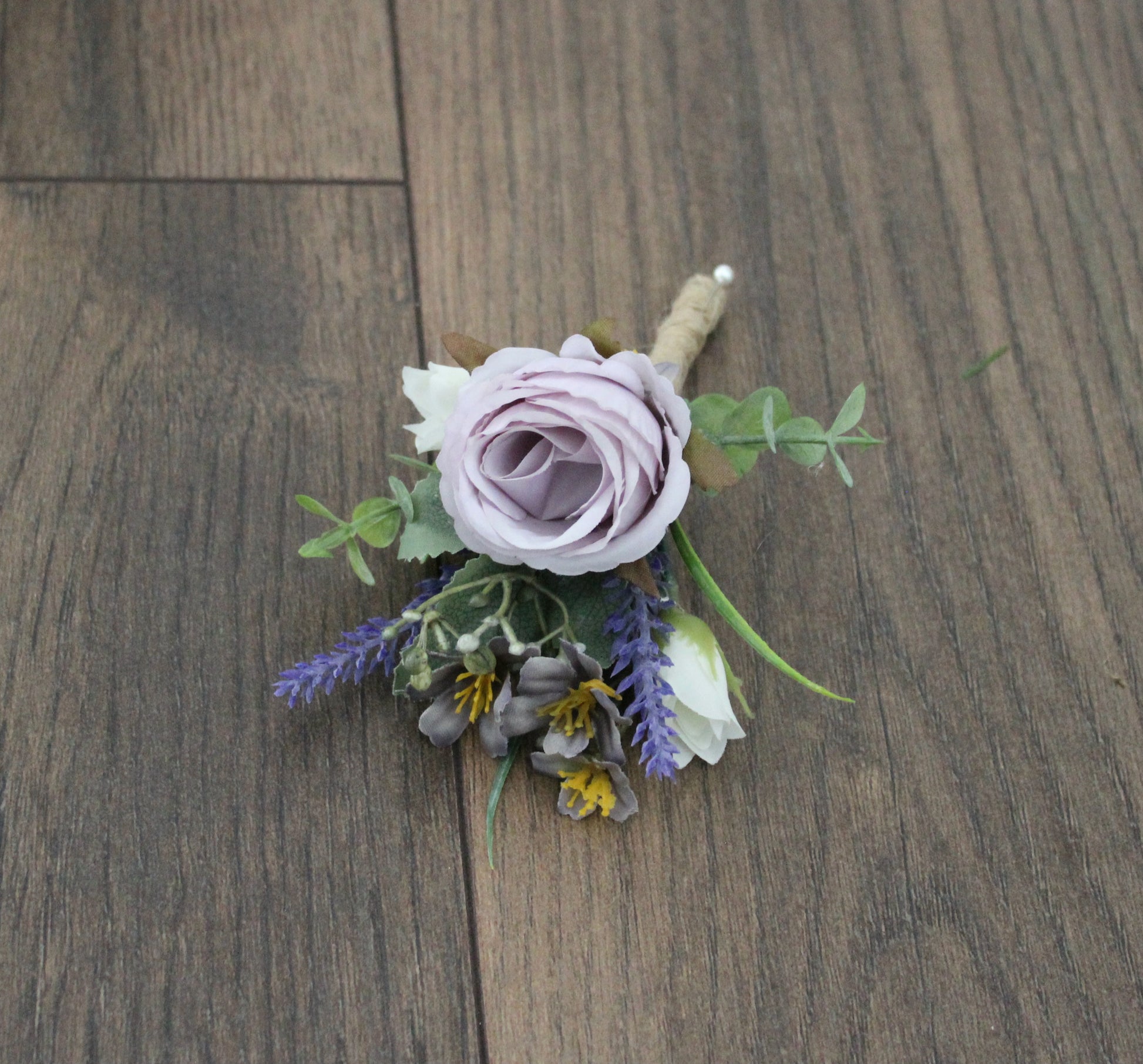 These beautiful buttonholes contain a very high grade single stem silk rose lavender, eucalyptus, rose spray and an extra spray of gypsophila for the Groom
