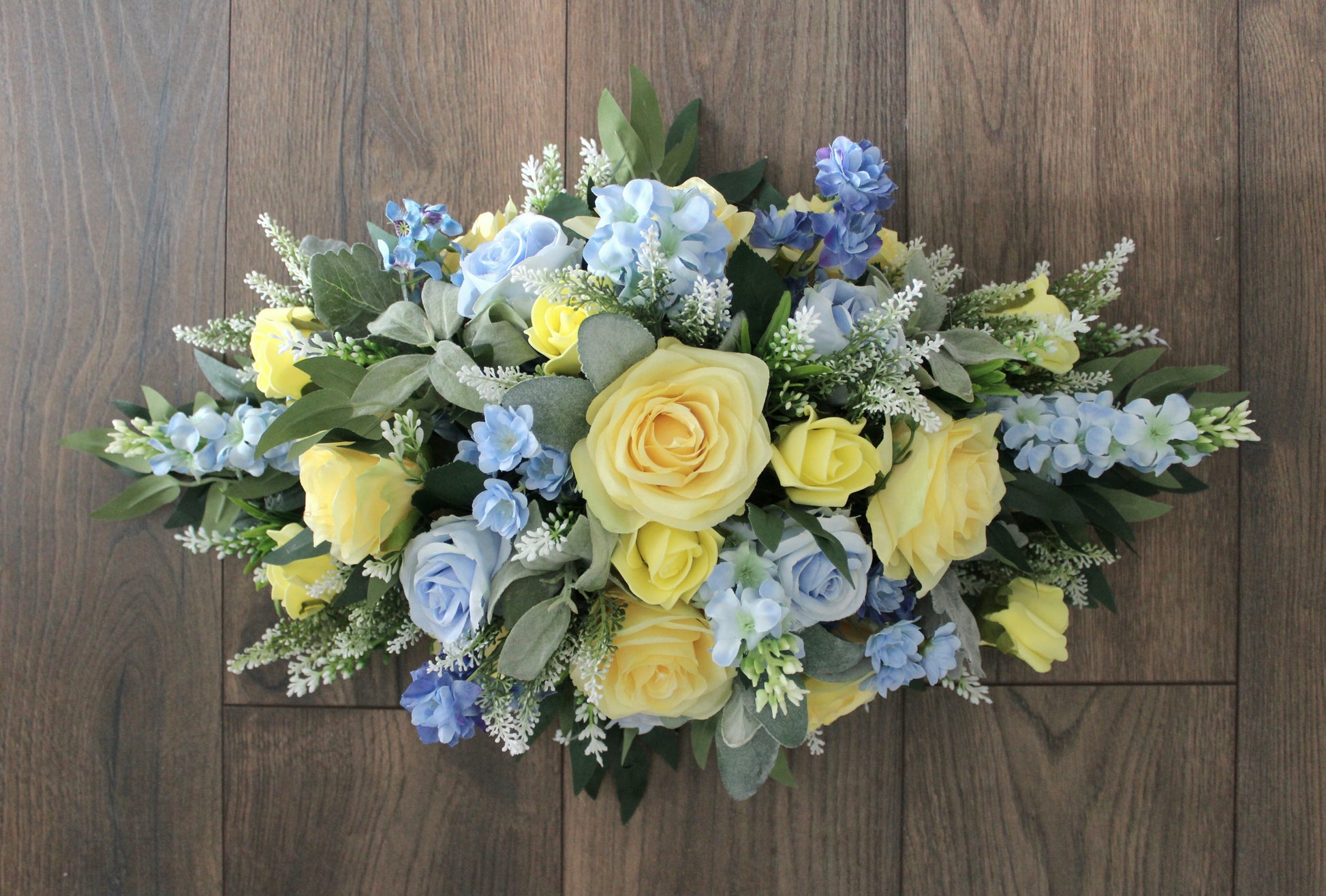 A stunning handmade table centrepiece created using high grade single stem silk roses, ficus, lambs ear leaves, astilbe, delphinium and willow leaves