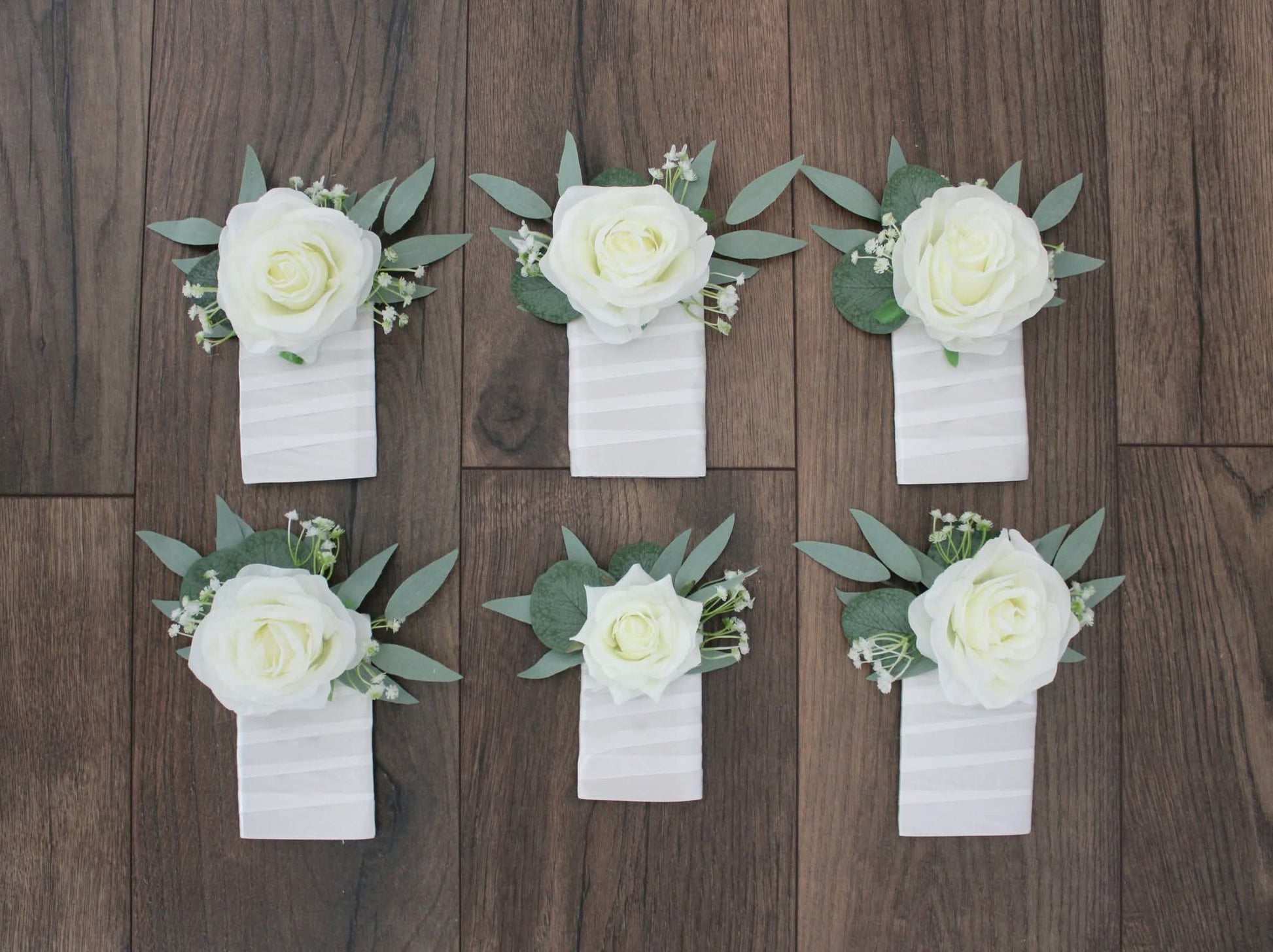 These classic buttonholes contain very a high grade single stem silk open rose, willow leaves and gypsophilia