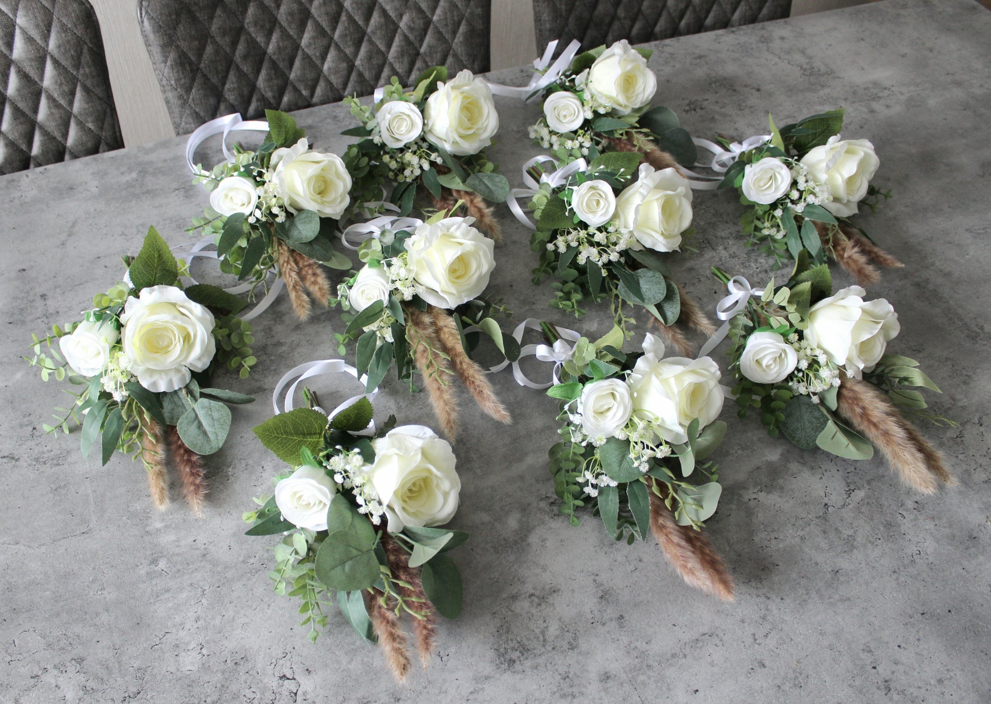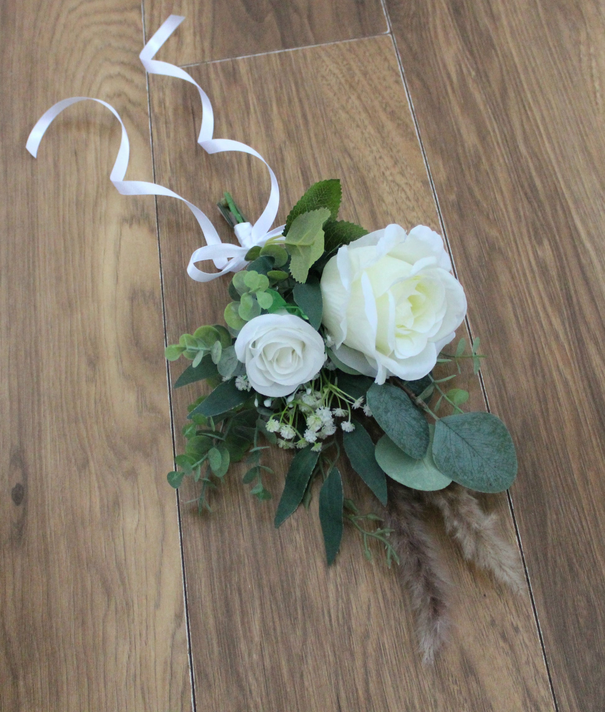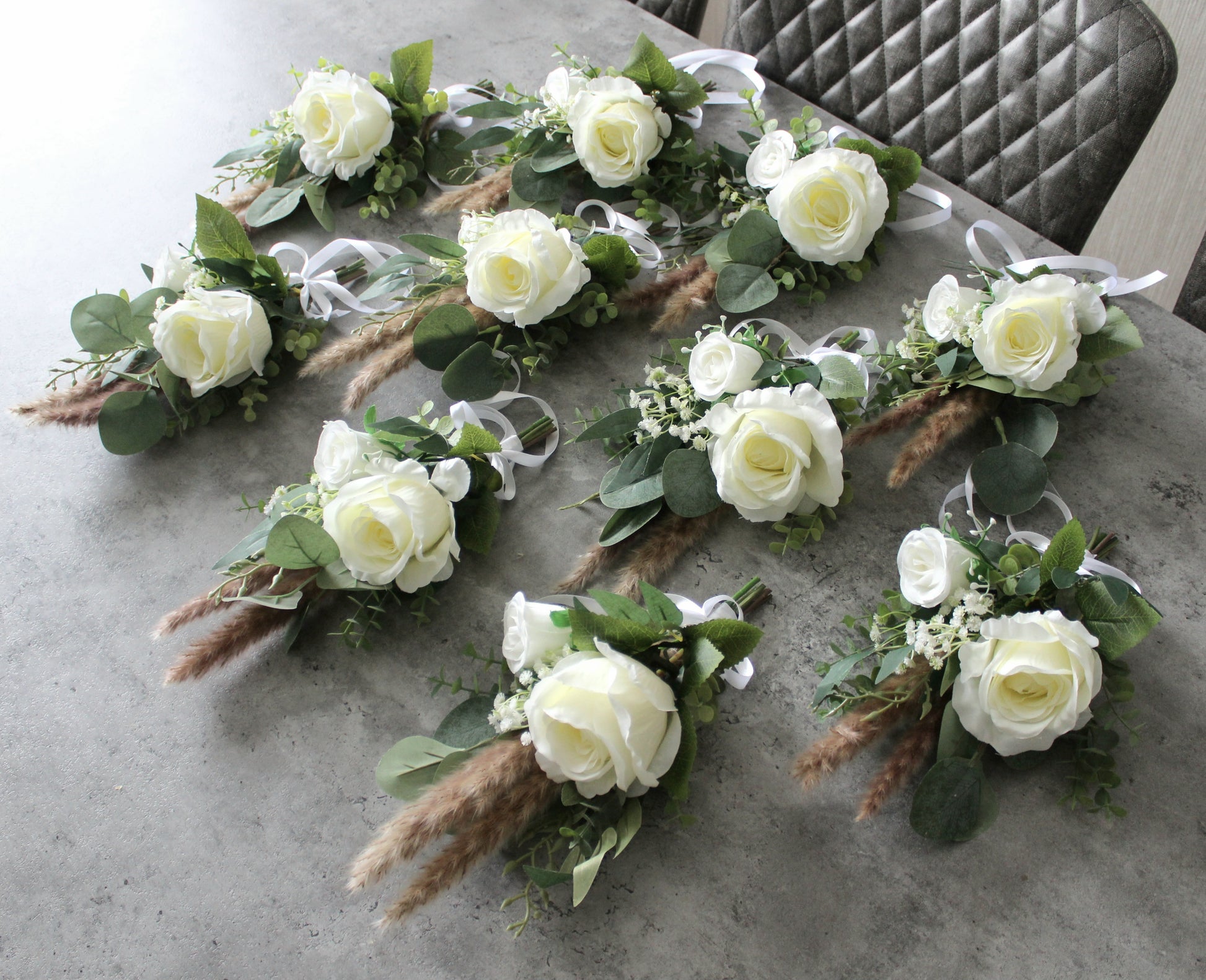 Beautiful hand tied arrangements for pew ends or chairs. Created using very high grade single stem silk roses, gypsophilia, eucalyptus, willow leaves and dried pampas sprays.