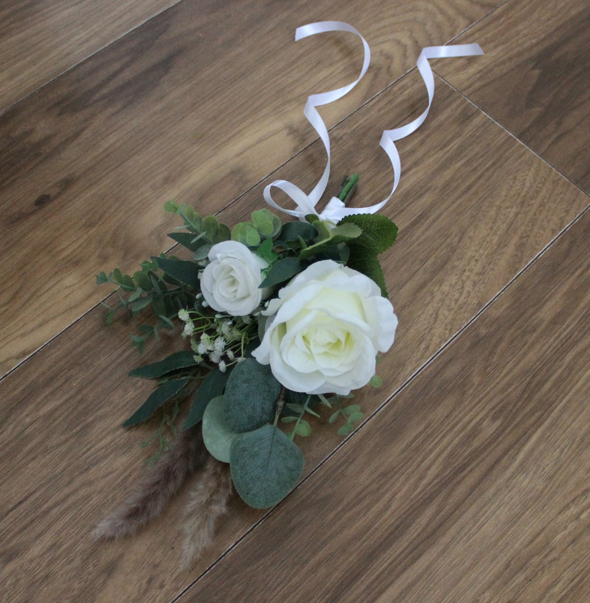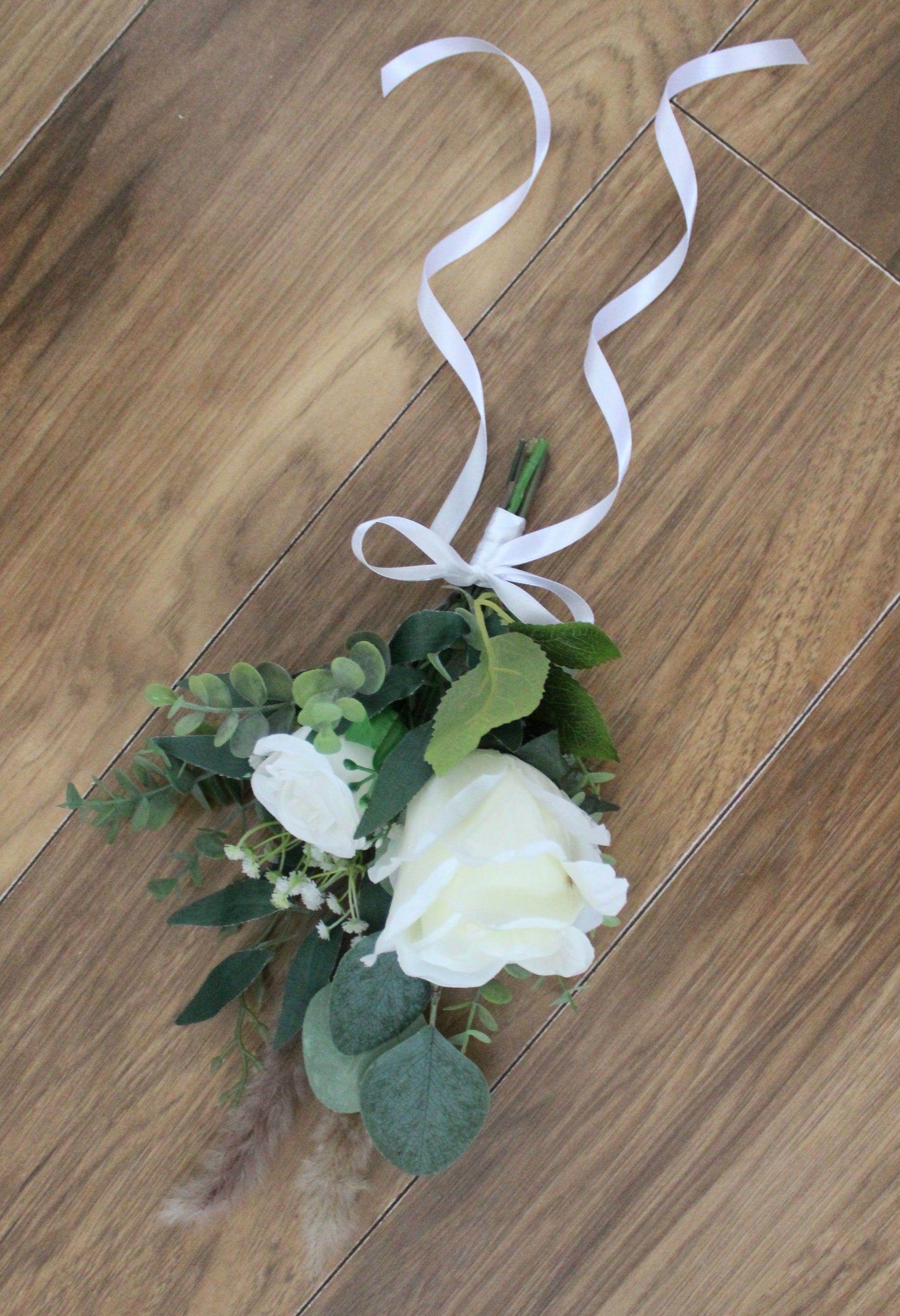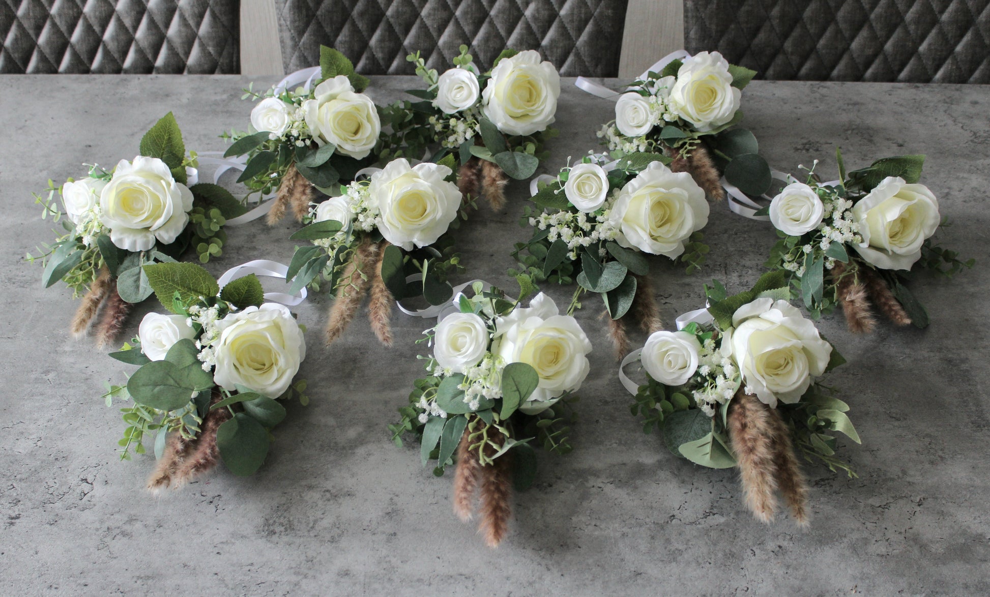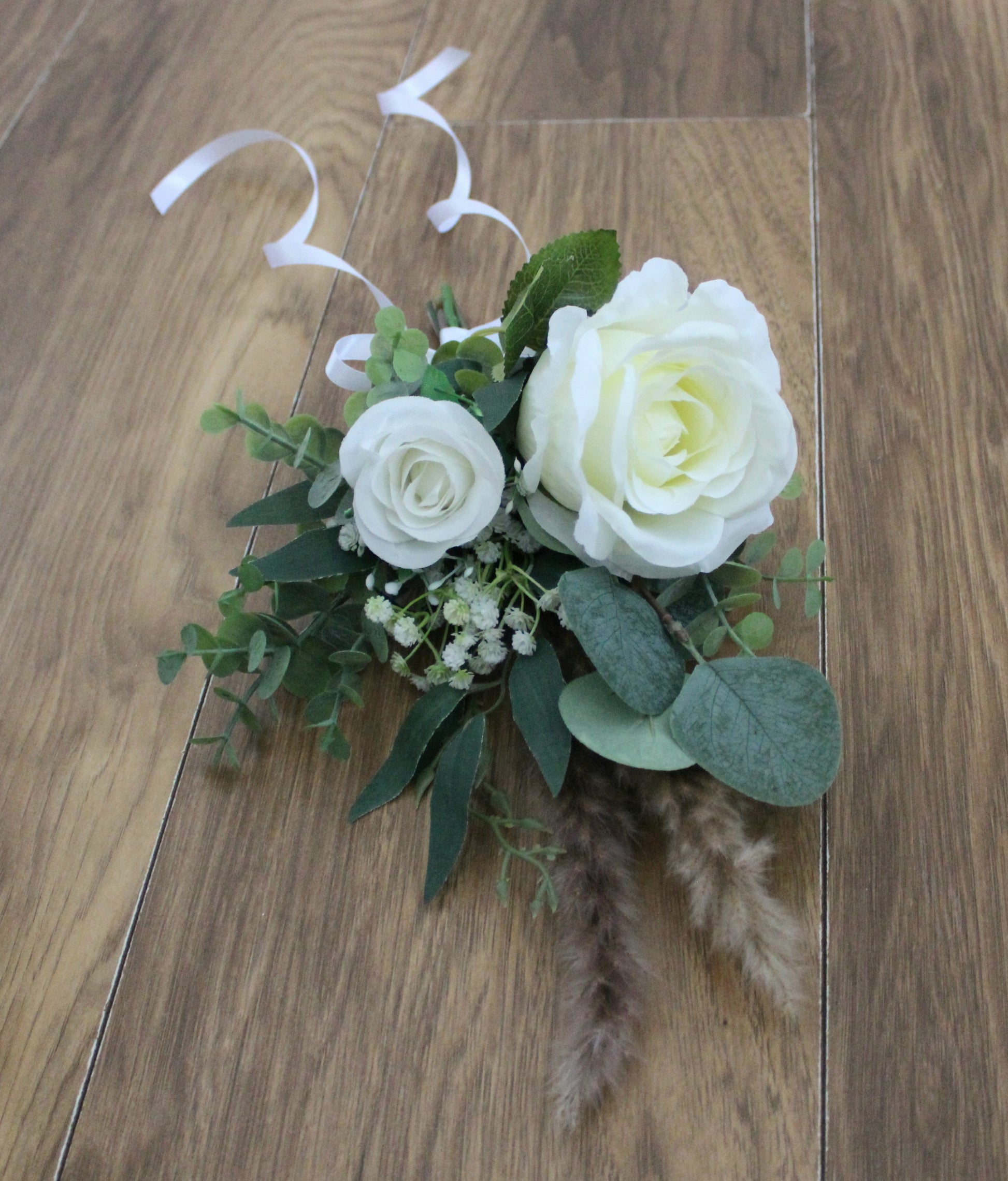 Beautiful hand tied arrangements for pew ends or chairs. Created using very high grade single stem silk roses, gypsophilia, eucalyptus, willow leaves and dried pampas sprays.
