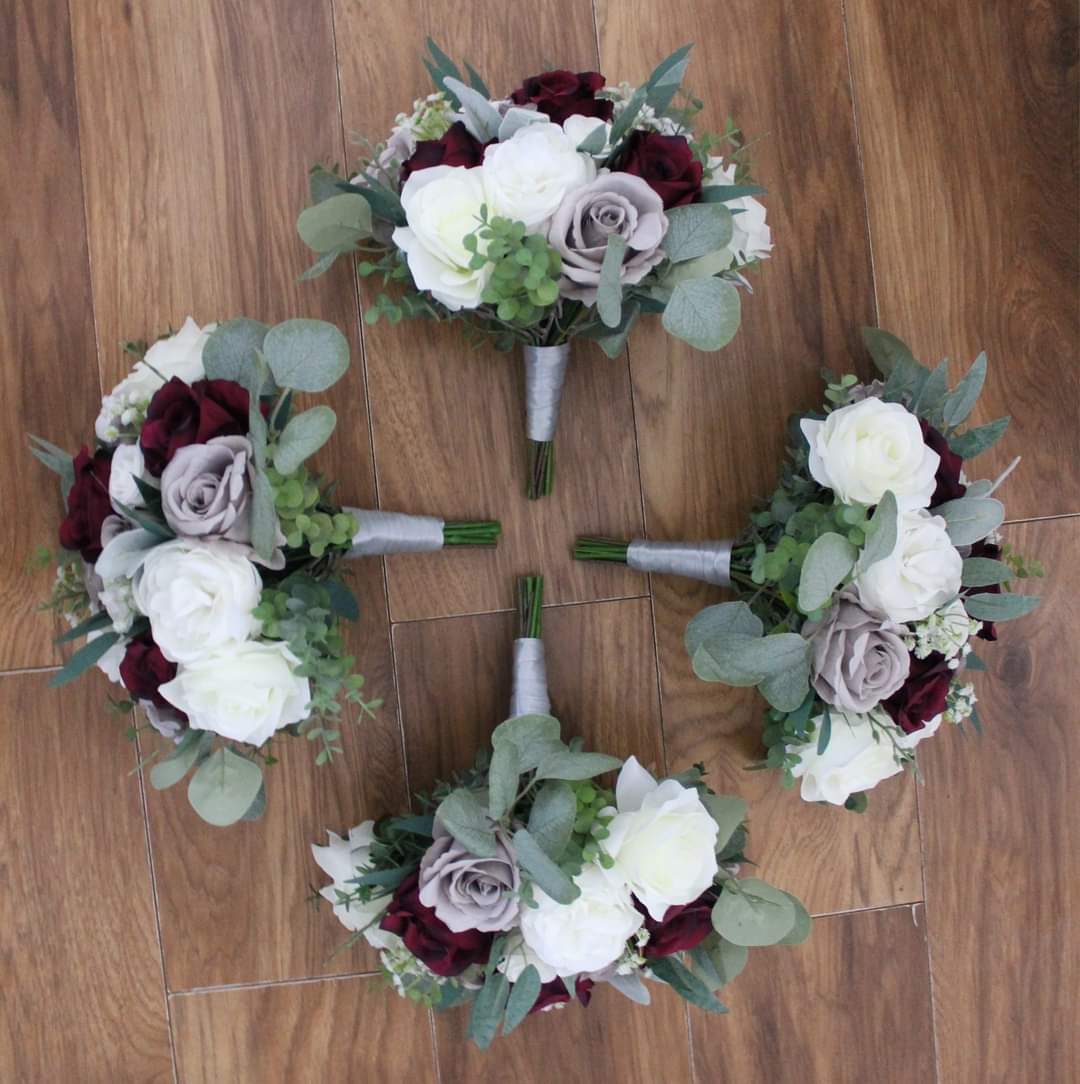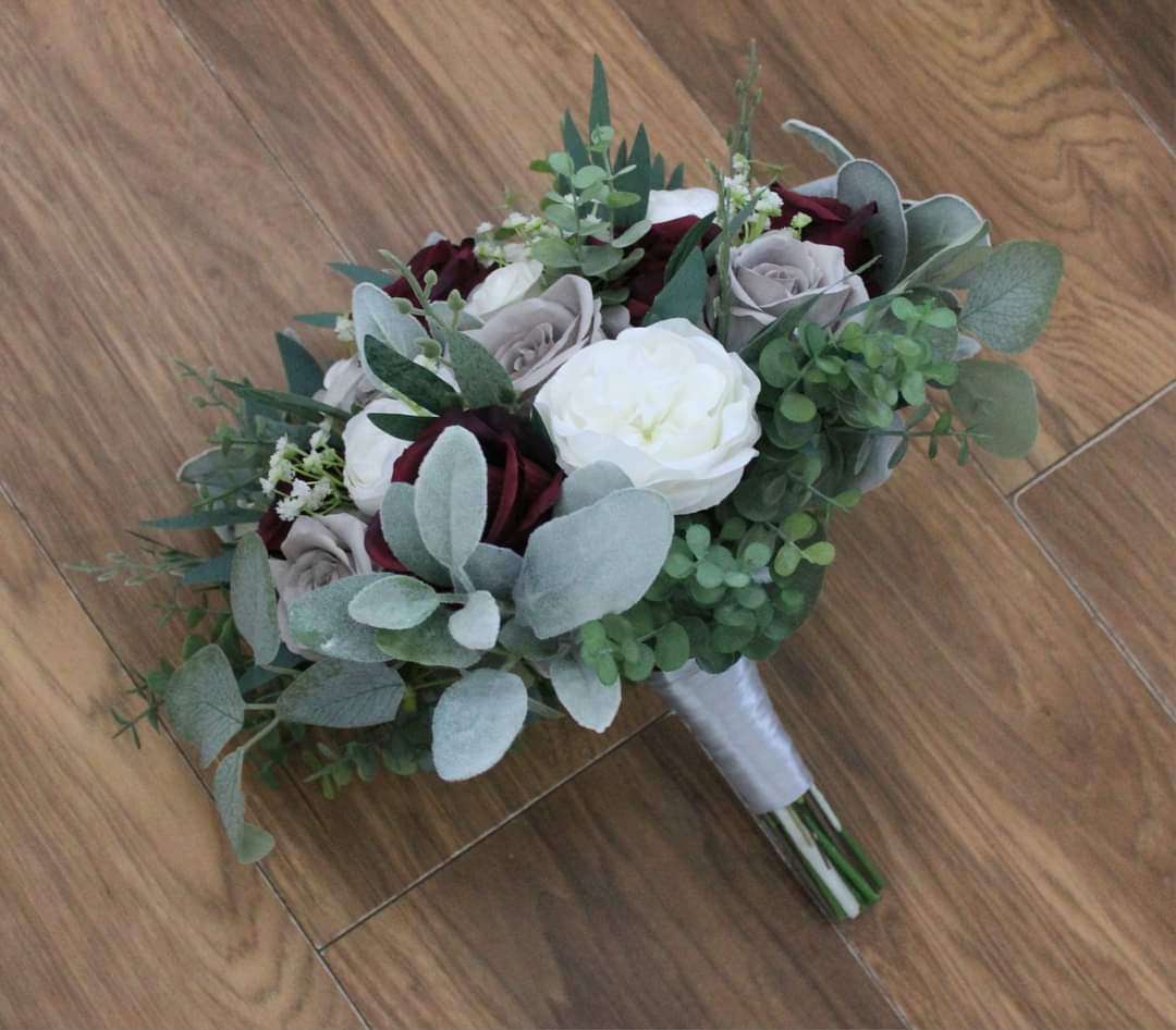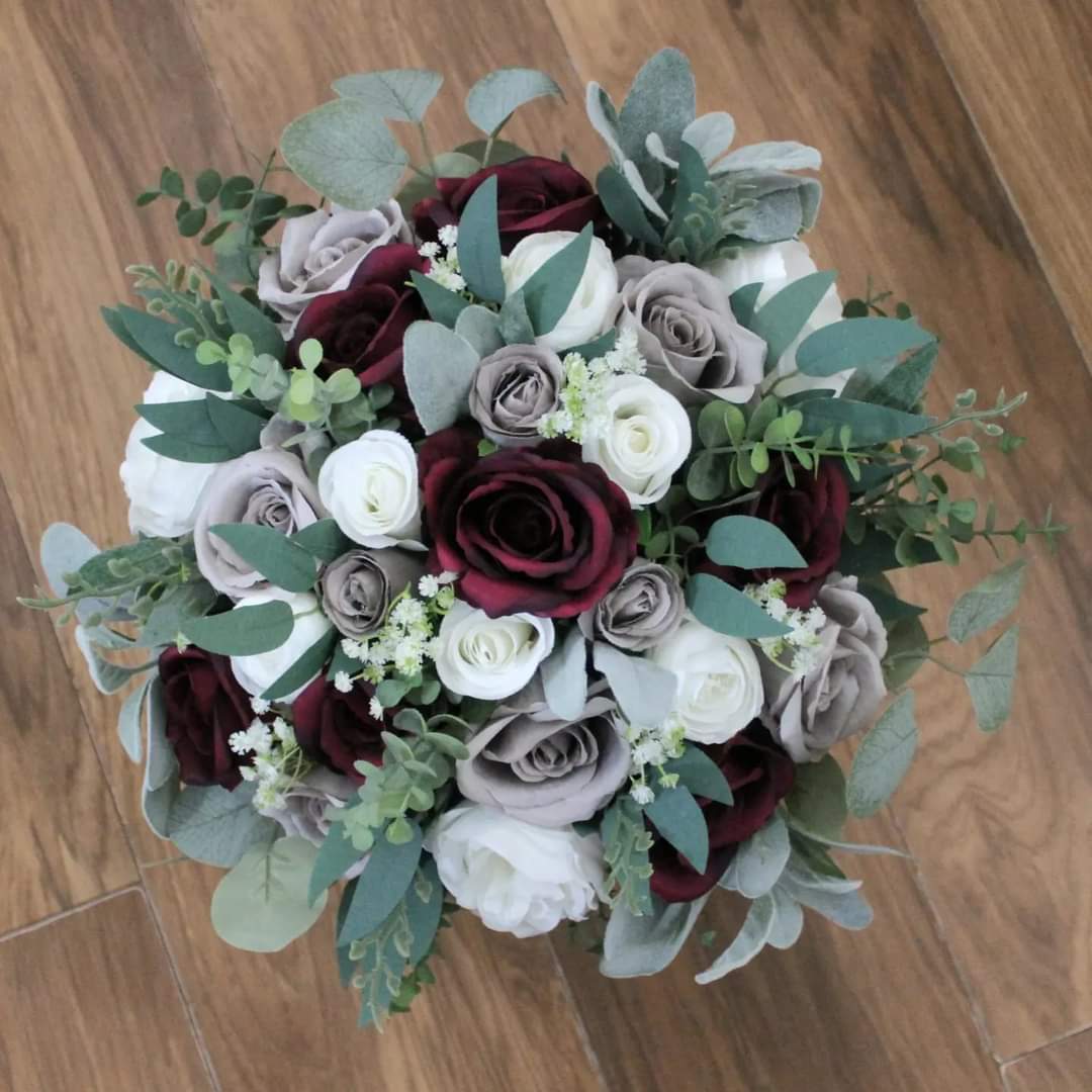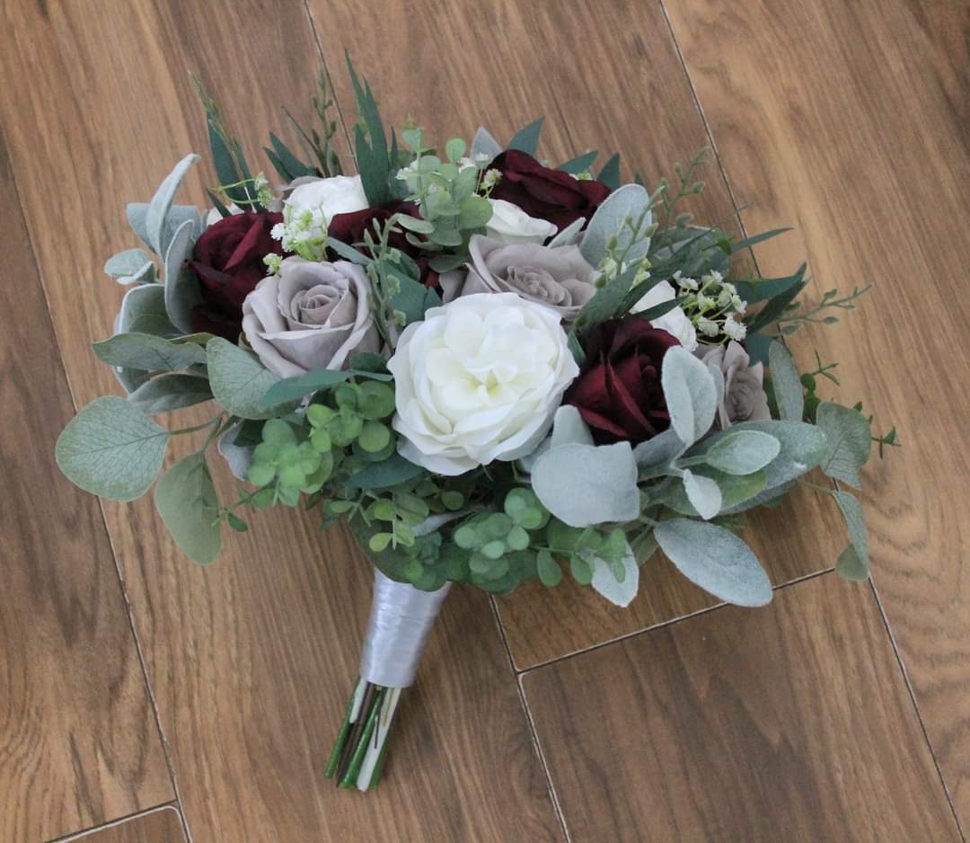 Photo shows burgundy, grey and ivory flowers with grey ribbon.