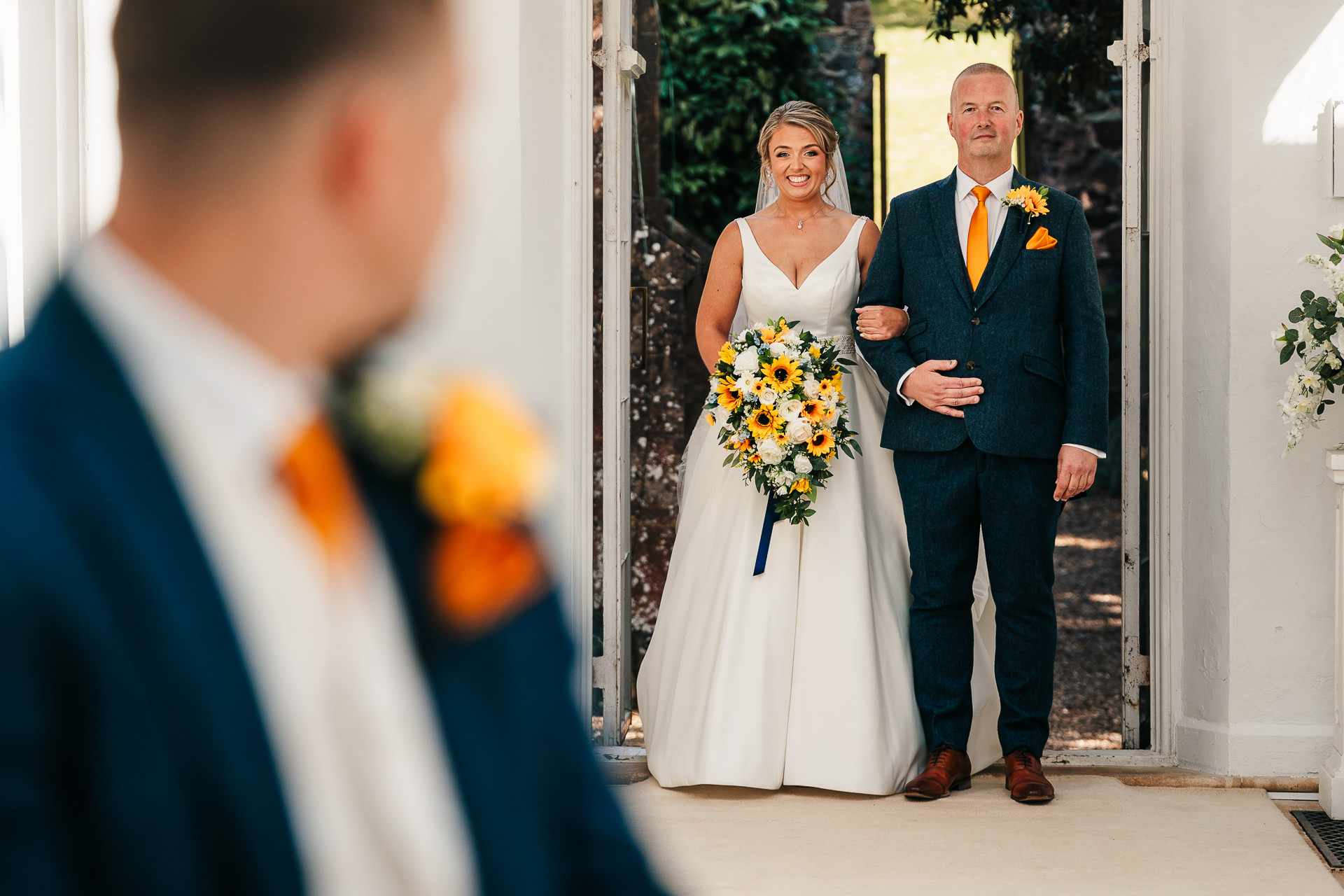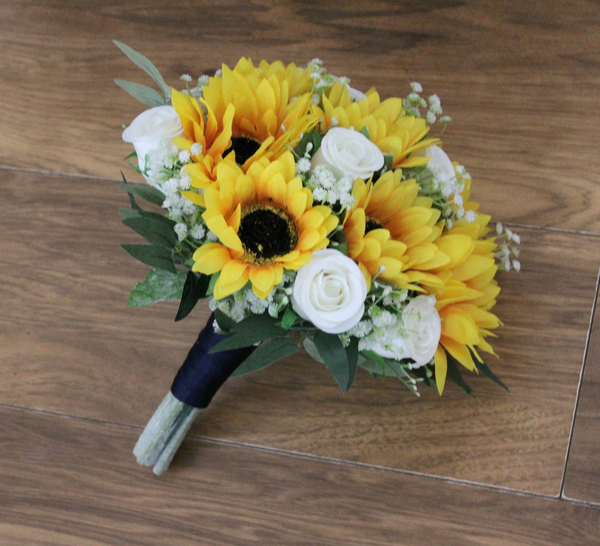 This stunning bridal teardrop/ cascade bouquet is created using very high grade single stem silk sunflowers, roses, gypsophilia, daisies, willow leaves, ficus and forget me nots.