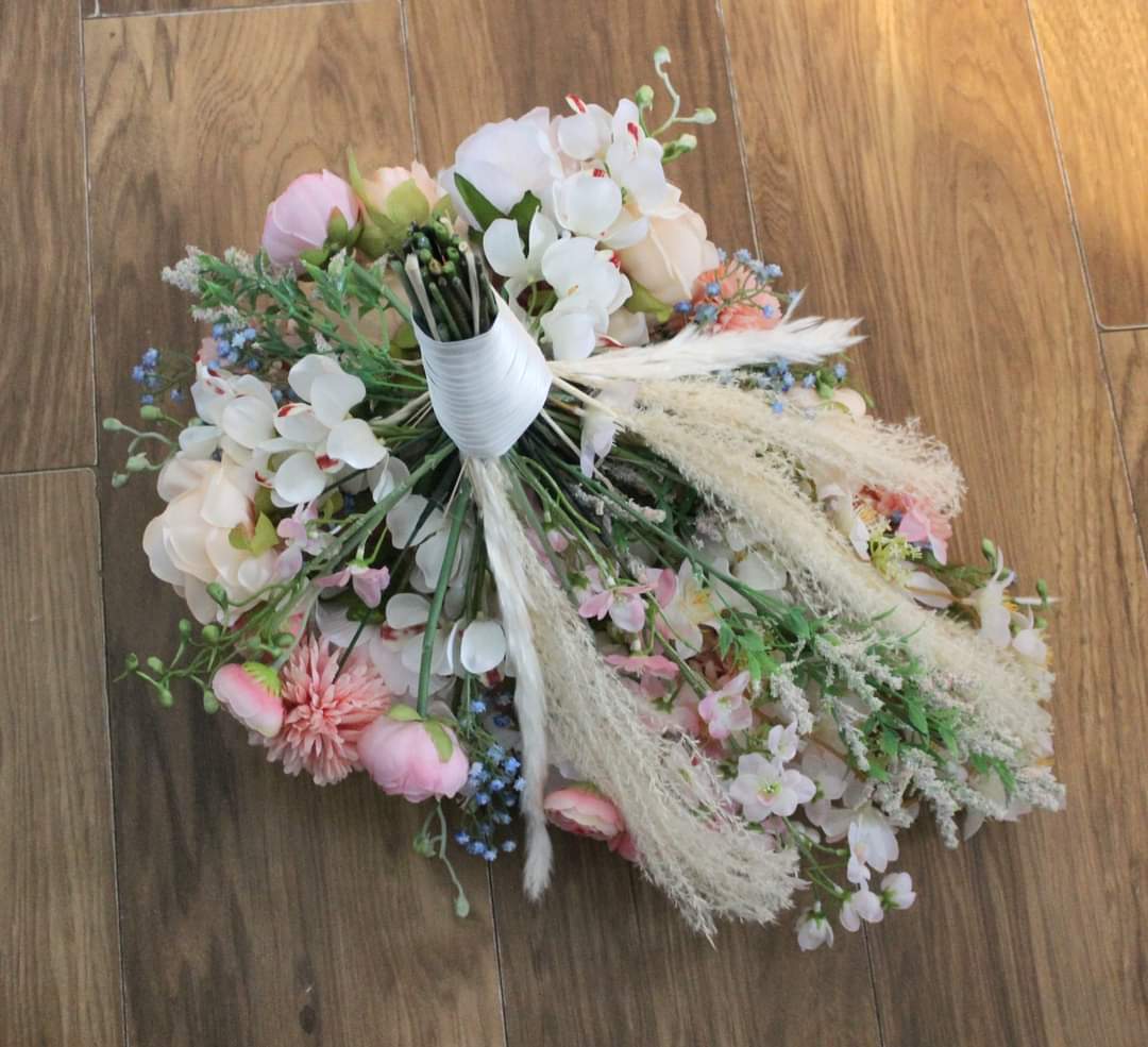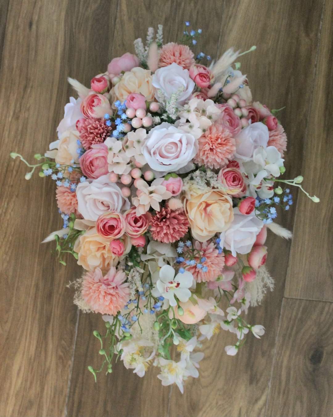 A magnificent spring themed handmade bridal bouquet, created using high grade single stem silk roses, peonies, pom pom dahlia, astilbe, orchids, berries, gypsophilia, delphinium, ranunculus, blossom, dried pampas sprays and dried bunny tails.