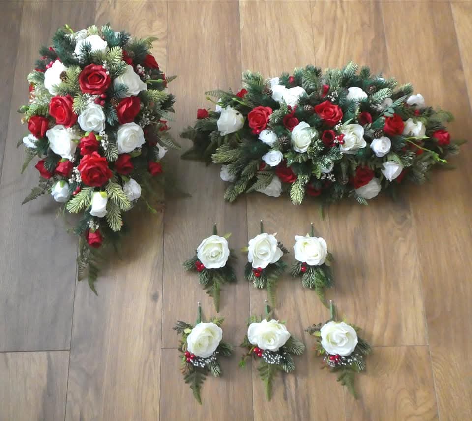 Beautiful Christmas/winter themed ladies pin on corsage containing a high grade silk rose, pearl loops, fern, spruce and berries.