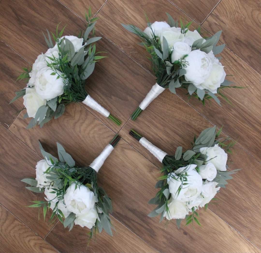 A Stunning handmade bridal bouquet created using very high grade single stem silk roses, eucalyptus, willow leaves, delphinium, daisies, astrantia, bamboo leaves and gypsophilia.