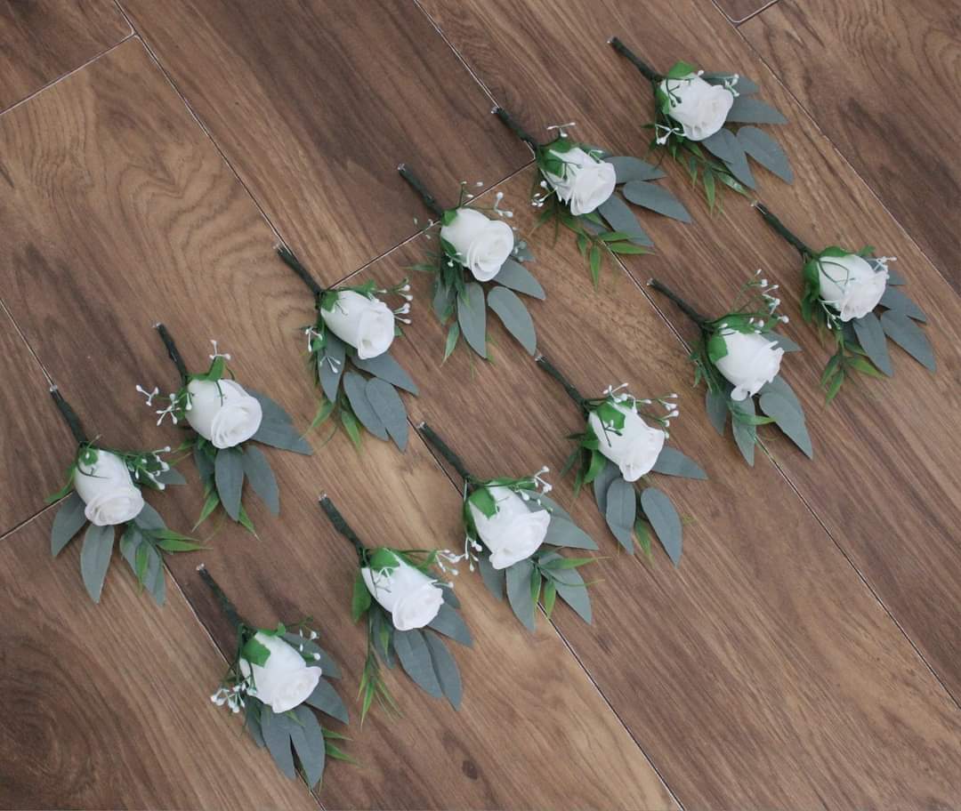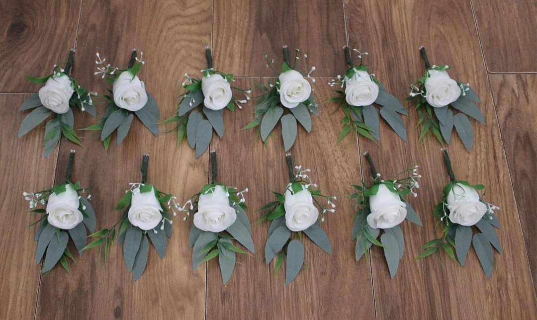 A beautiful handmade buttonhole or corsage created using a silk rose, willow leaves, gypsophilia and bamboo leaves.Grooms buttonhole will contain two roses