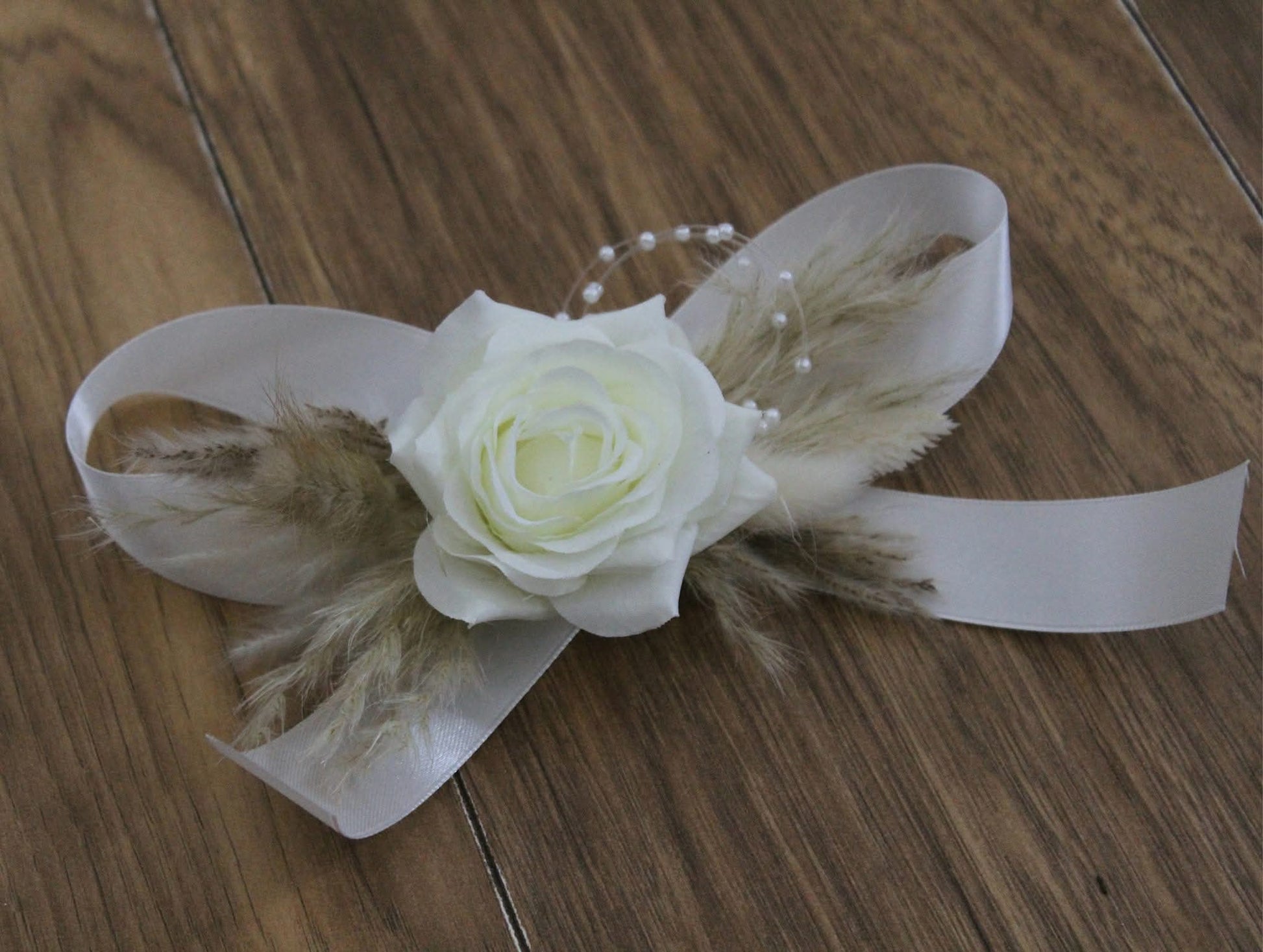 A beautiful handmade wrist corsage created using a high grade single stem silk rose, pampas sprays, bunny tails and pearl loops.