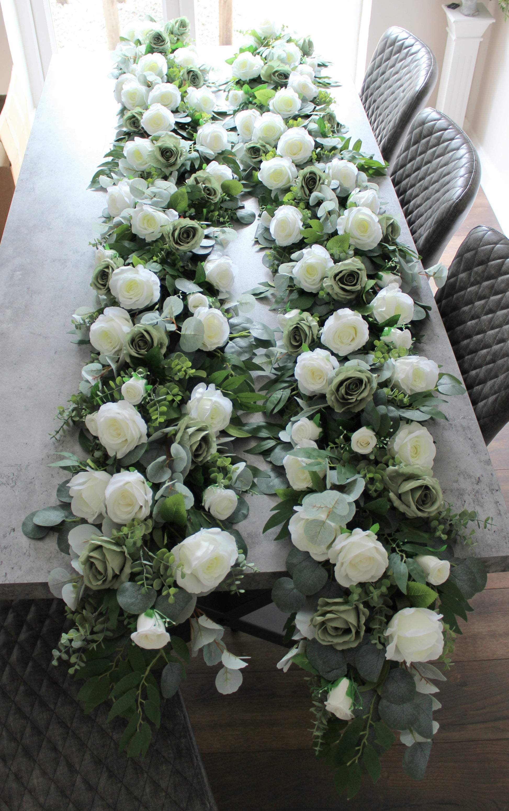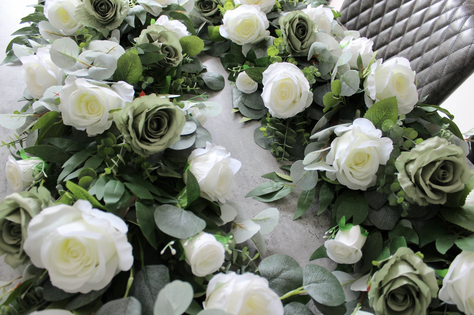 A stunning thick and full handwired garland created using very high grade single stem silk roses, eucalyptus, willow leaves and gypsophila.