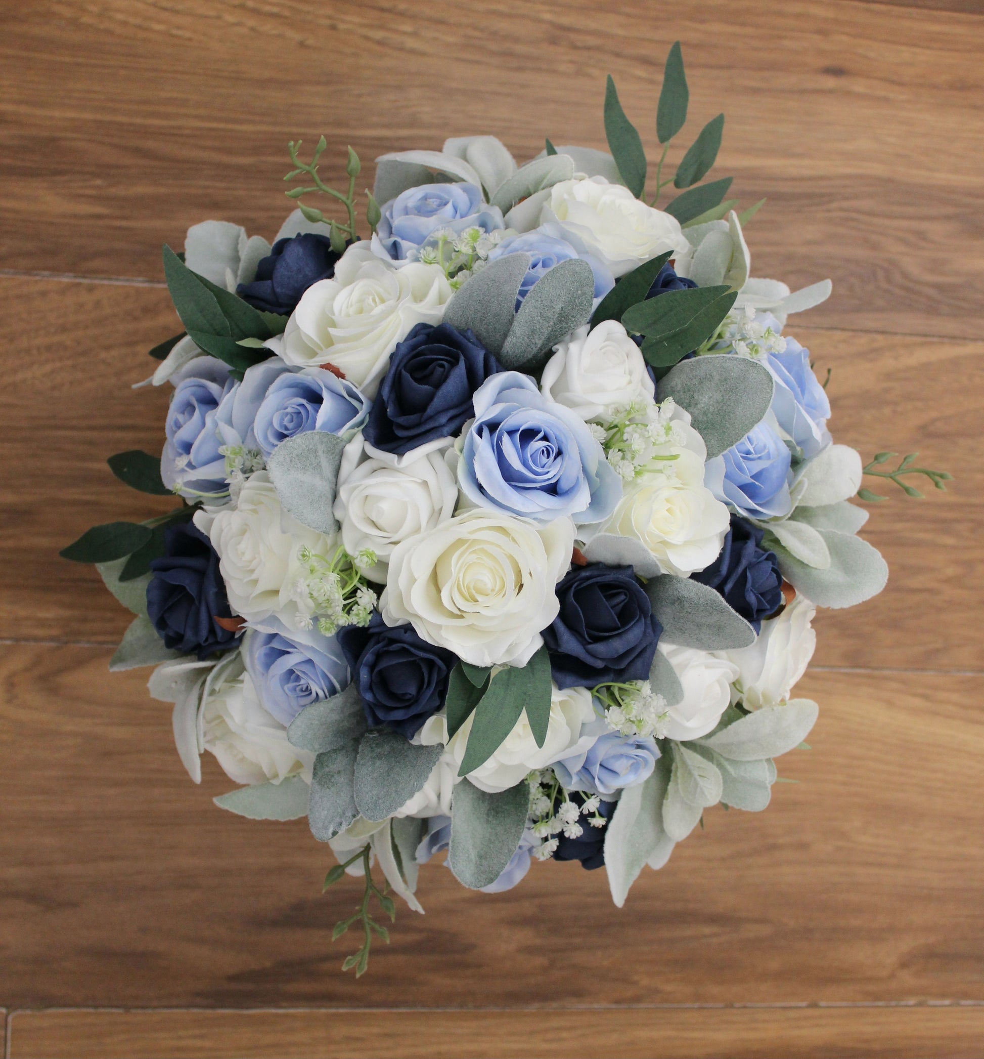 A Gorgeous handmade bouquet created using very high grade single stem silk roses, eucalyptus, lambs ear, willow leaves, gypsophilia and colourfast foam roses.