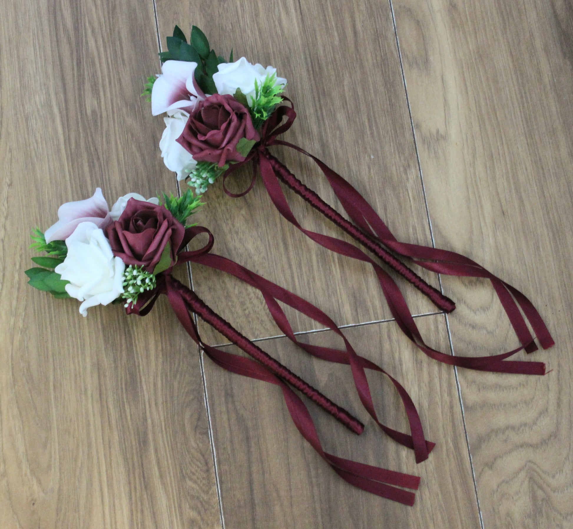 A stunning handmade flower girl wand created using high grade colourfast foam roses, a real touch calla lily, tea leaves, ruscus and gypsophilia.