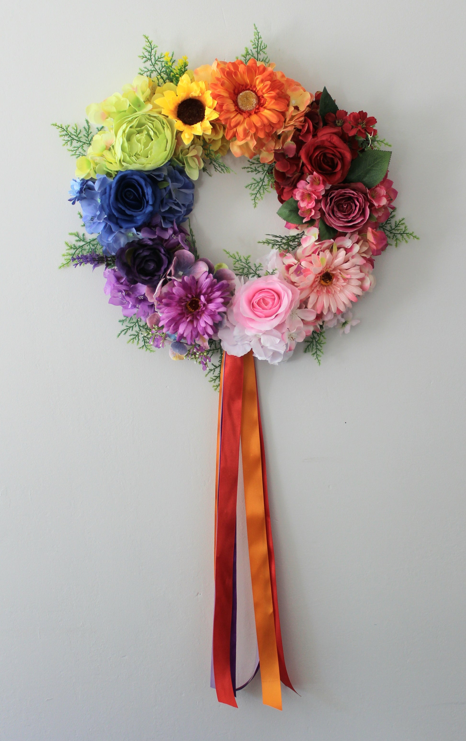 Flowers types may be different to the photo due to stock availability, but all wreaths will contain orange, red, blue, pink, lilac, purple, green and yellow.